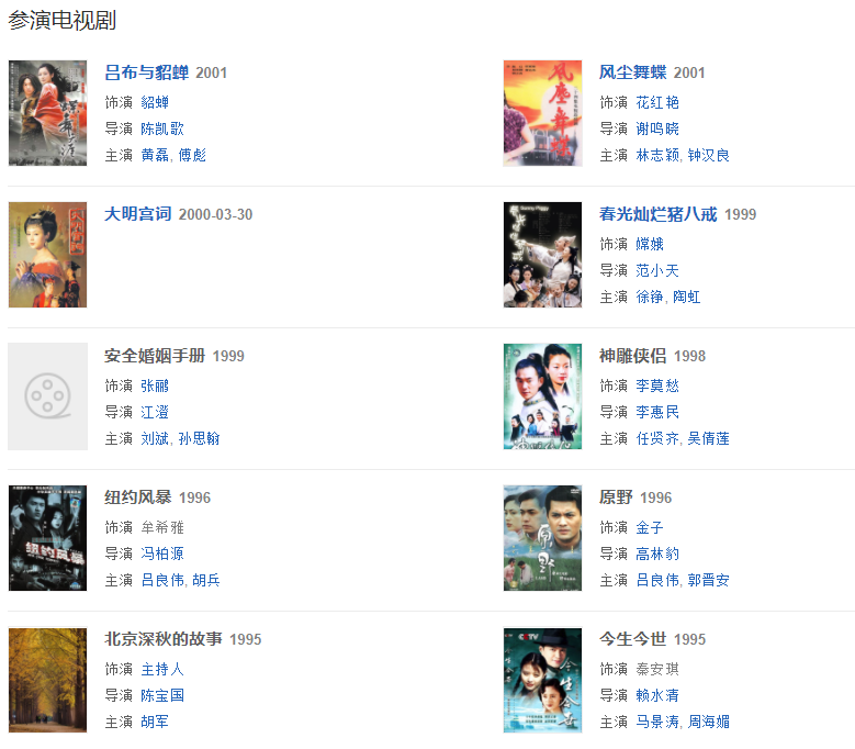 1985年,參演個(gè)人首部電影《這里有泉水》,飾演余多正式出道。1989年,參演電視劇《紅樓夢》,飾演紫鵑。1991年,參演電視劇《三國演義》,飾演貂蟬。1993年,參演電視劇《梅花三弄》,飾演汪子璇。1998年,參演電視劇《大明宮詞》,飾演太平公主。